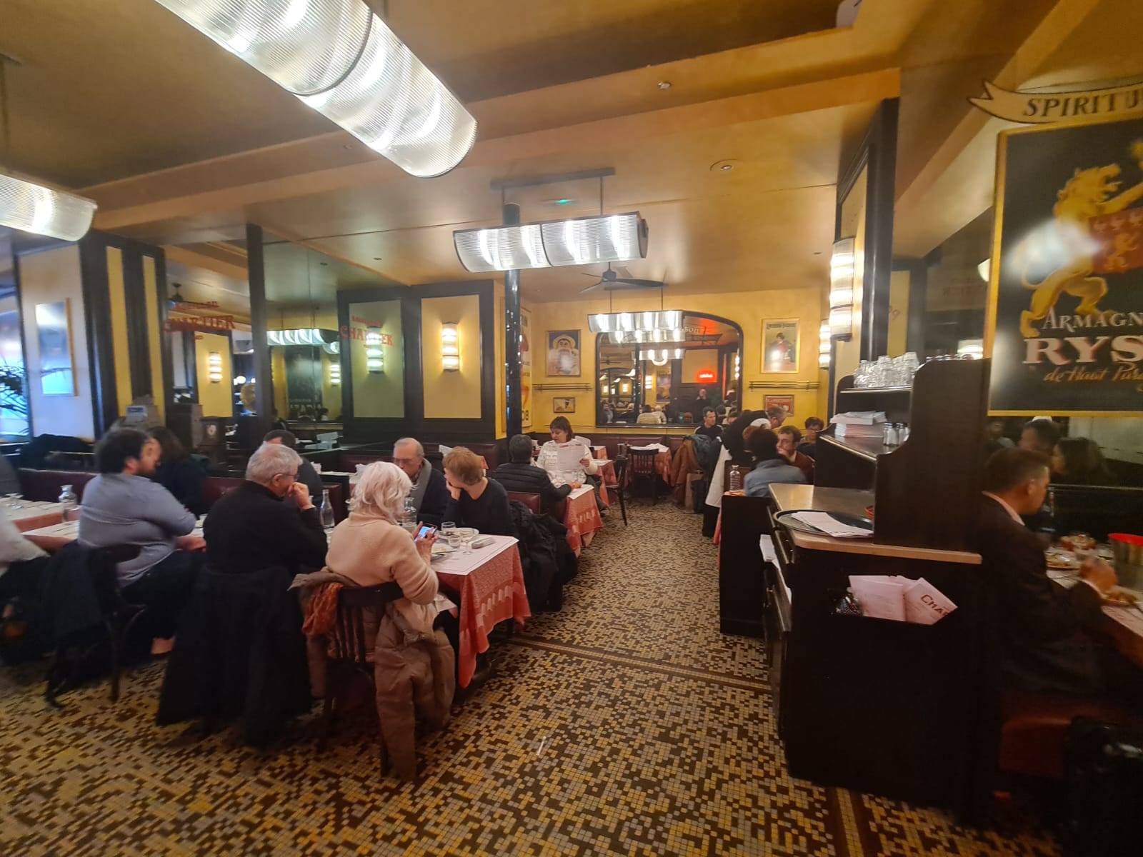 Como detesto pegar metrô por aqui já que as estações com escadas rolantes são poucos prefiro sempre busão que são confortáveis e silenciosos (a maioria é elétrico). O trajeto até ‘La Criée’ previa pegar o 38 até Gare de l’Est e depois pegar o 58 e estaríamos lá. Porém e como todas as histórias têm um, ou vários poréns, o busão parou em frente a Gare. Ao descermos na Place 11 de novembro 1918 (data do meu aniversário e a data da rendição da Alemanha durante a I Primeira Guerra Mundial) olhei para o outro lado da rua e vi o logotipo da filial do ‘Boillon Chartier’ sem fila nenhuma, o que é impossível em Montparnasse. Aí veio a dúvida: o que escolher. Não teve questão com o frio. O melhor é comida francesa tradicional quente, com meia garrafa de vinho. Pedi um ‘boudin noire’ (chouriço) com purê e maçã.