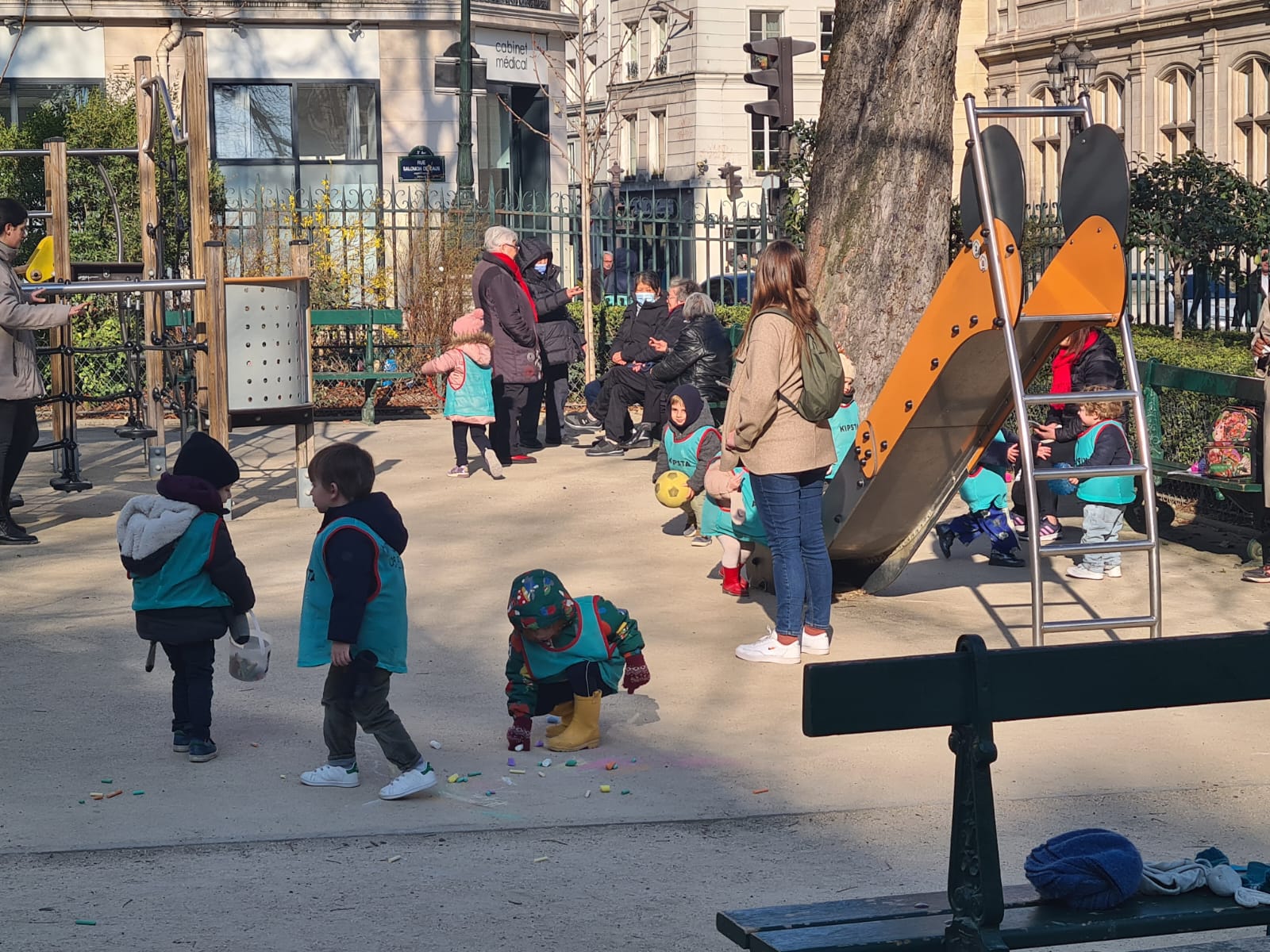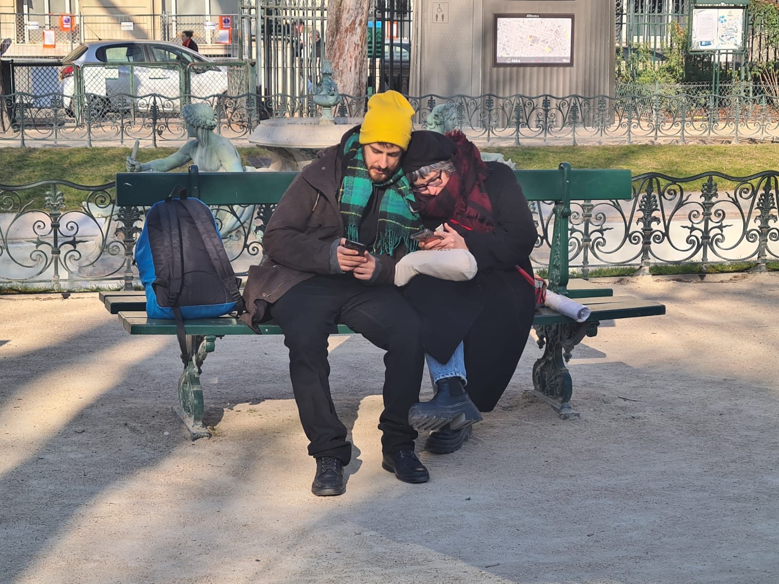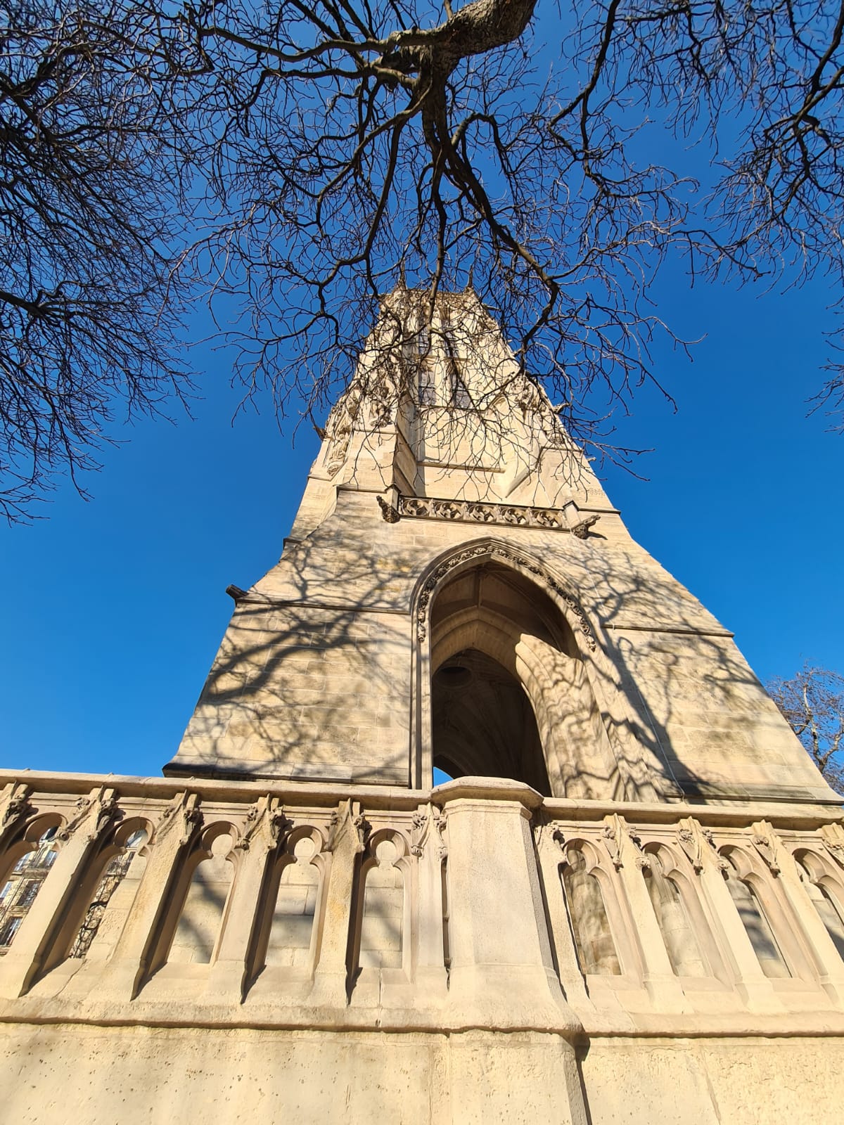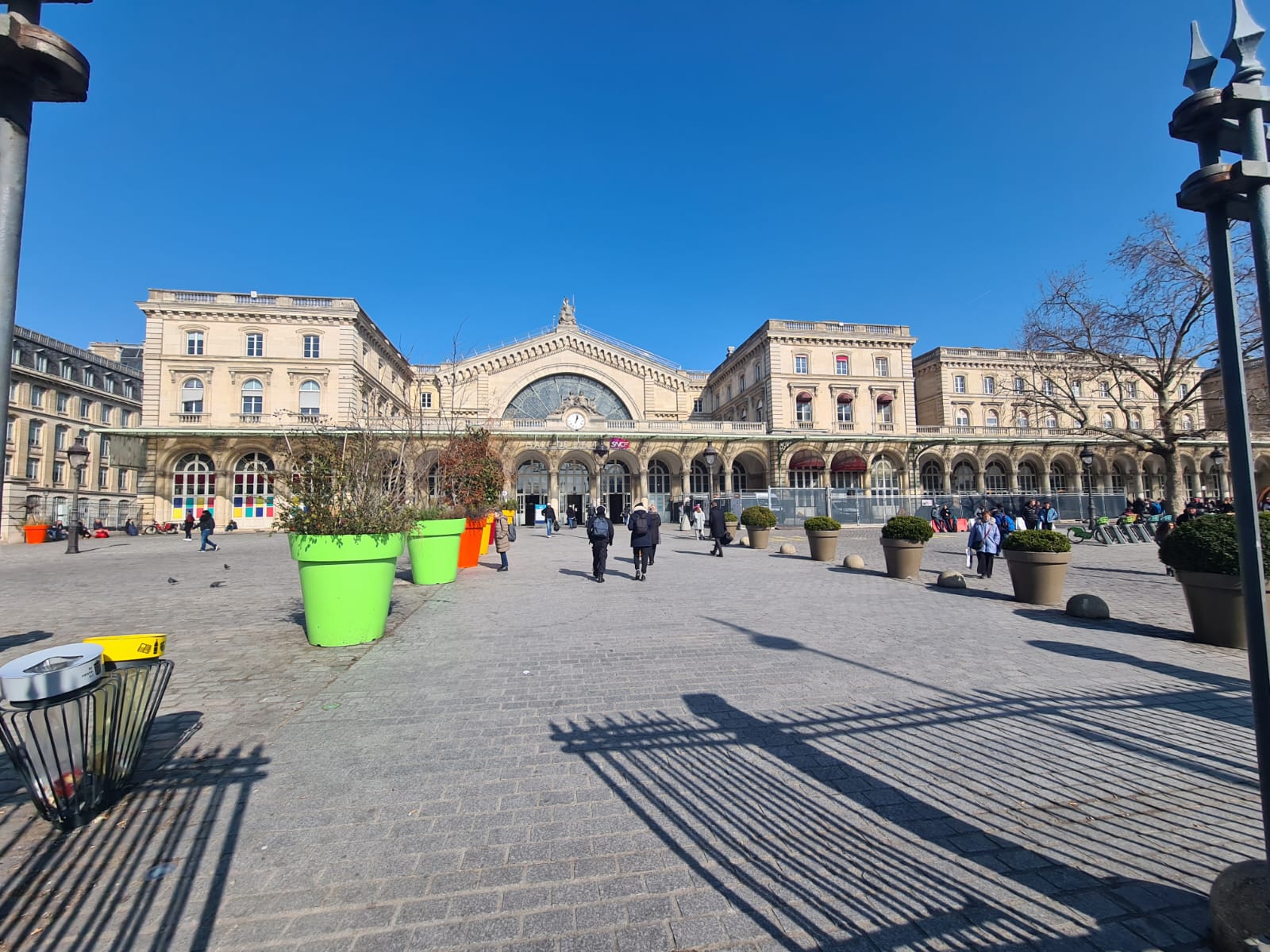 Bem, chegamos ao Square de Saint Jacques onde havia muita gente sentada nos bancos e nas amuradas tomando sol para espantar o frio. Dia lindíssimo e uma visão curiosa. De um lado arvores secas e de outro arvores floridas (e olhem que não chove aqui há quase 60 dias em pleno inverno, um recorde). A Lua já quase cheia observava placidamente o burburinho das ruas, sem prestar muita atenção nas pessoas que sorriam para ela.