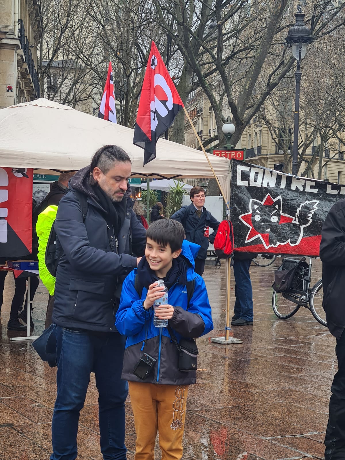 Após almoço fomos em direção ao Boulevard Saint Michel pegar o 38 e voltar para casa. Na Place de Saint Michel, um grupo de sindicalistas da CNT já havia instalado barraca para se proteger da chuva e estavam acabando de montar as caixas de som. Ao longe, ao lado do prédio da polícia, que fica na Île de La Cité. havia mais de 20 caminhões com tropa de choque, pronta para agir. Hoje meus amigos Gilberto Gonçalves, querido Giba, e o poeta e jornalista Pitágoras terão fotos e vídeos inéditos para ilustrarem seus blogs. Giba com Jornal do Taquaral de Campinas e Pitágoras com Cancioneiro Caiçara, site referência de bom jornalismo para todo litoral norte paulista.
