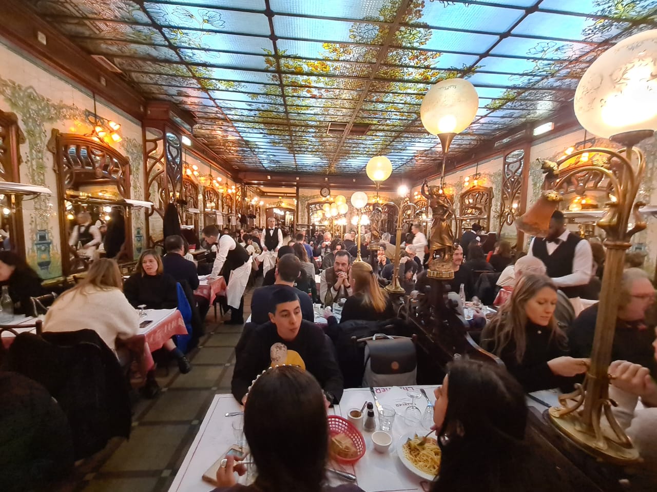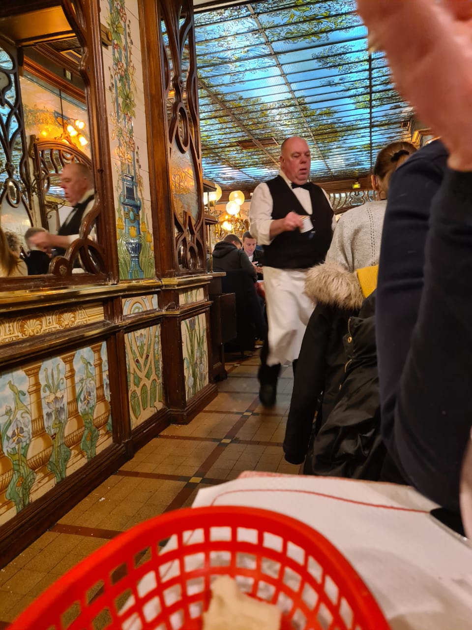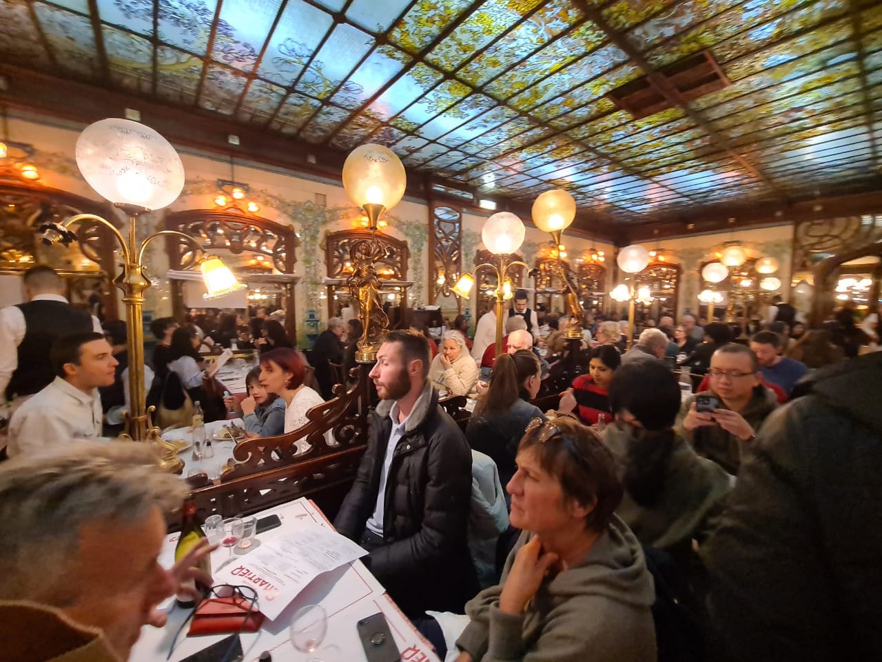 Como a boca do metro, da linha 4, está logo ali entrei nela para ir até a estação da ‘gare de Montparnasse’ onde está localizado o ‘Bouillon Chartier’ que narrei aqui dias desses que é o lugar com comida francesa, de qualidade, mais barato da cidade. O restaurante é imenso todo decorado de art nouveau. O Bouillon Chartier inaugurou aqui sua filial, em 1906. Quando conheci esse local a primeira vez, há quase 30 anos, funcionava nesse prédio uma filial do restaurante do Bistrô Romain onde se comia barato e a preço fixo. Anos depois mudou de dono e mudou de nome para Bistrot de la Gare. Há uns 6 anos reinventaram a tradição e voltou a ser novamente Bouillon Chartier. Aqui se come barato mesmo com garrafa de vinho. Acreditem, a ‘bouteille de vin’ custa 10 euros, sim 10 euros. ‘Boudin noir’ (chouriço) 9,50. Sobremesa 2,5 euros com café. Pasmem. Só aqui para se sentir o rei do gado. A última vez que eu e Wilma estivemos aqui foi há três anos na companhia de Malu e Temístocles, e de Aline e Karine.