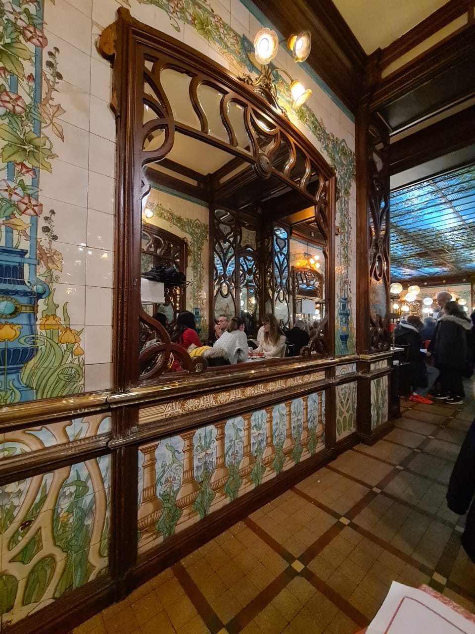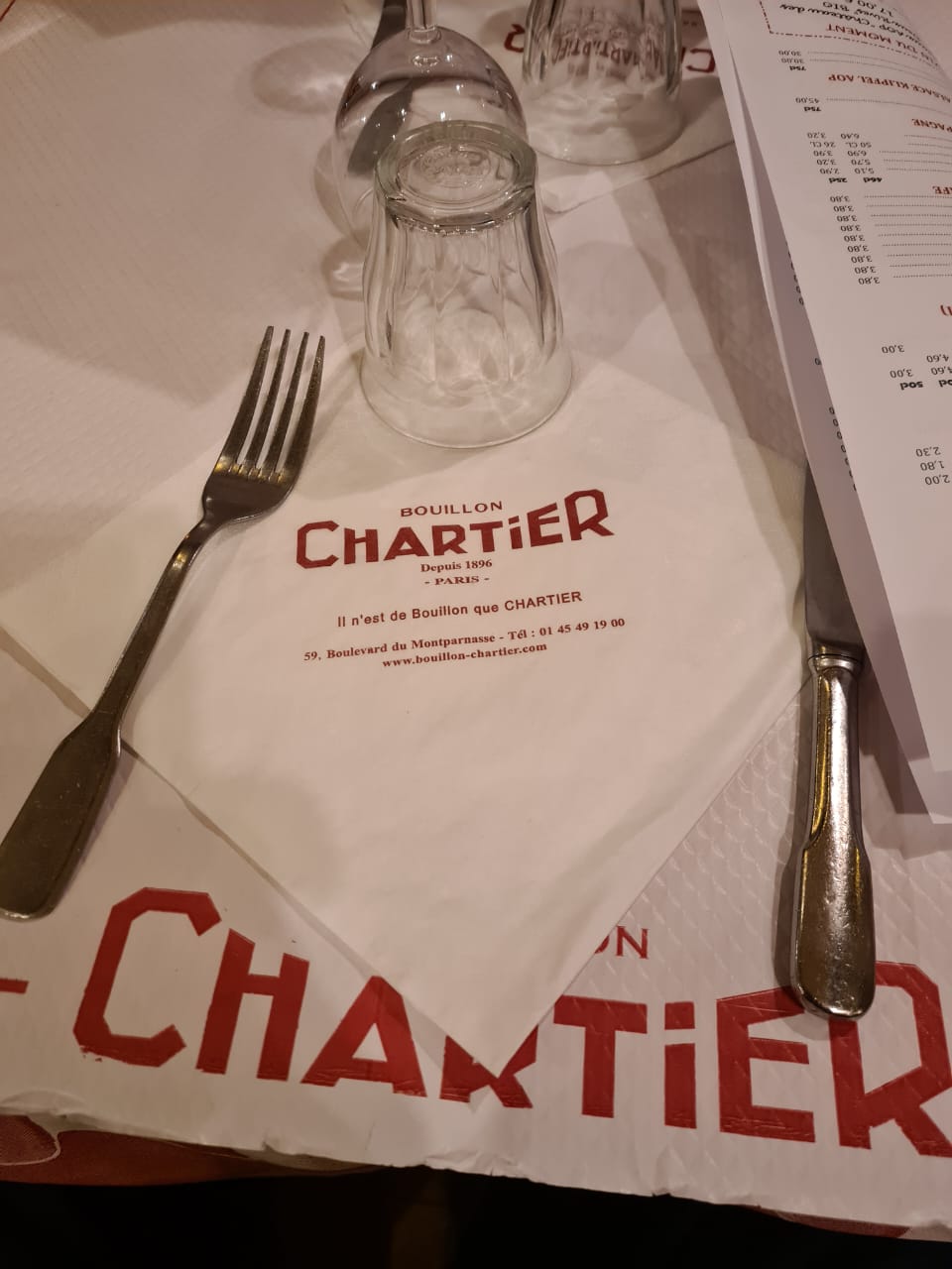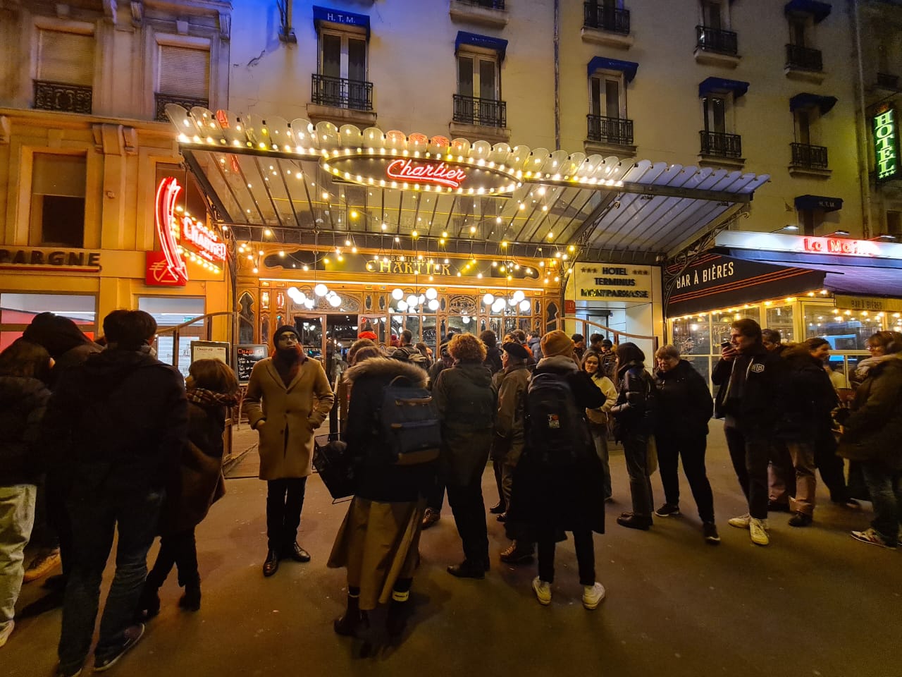 Como a boca do metro, da linha 4, está logo ali entrei nela para ir até a estação da ‘gare de Montparnasse’ onde está localizado o ‘Bouillon Chartier’ que narrei aqui dias desses que é o lugar com comida francesa, de qualidade, mais barato da cidade. O restaurante é imenso todo decorado de art nouveau. O Bouillon Chartier inaugurou aqui sua filial, em 1906. Quando conheci esse local a primeira vez, há quase 30 anos, funcionava nesse prédio uma filial do restaurante do Bistrô Romain onde se comia barato e a preço fixo. Anos depois mudou de dono e mudou de nome para Bistrot de la Gare. Há uns 6 anos reinventaram a tradição e voltou a ser novamente Bouillon Chartier. Aqui se come barato mesmo com garrafa de vinho. Acreditem, a ‘bouteille de vin’ custa 10 euros, sim 10 euros. ‘Boudin noir’ (chouriço) 9,50. Sobremesa 2,5 euros com café. Pasmem. Só aqui para se sentir o rei do gado. A última vez que eu e Wilma estivemos aqui foi há três anos na companhia de Malu e Temístocles, e de Aline e Karine.